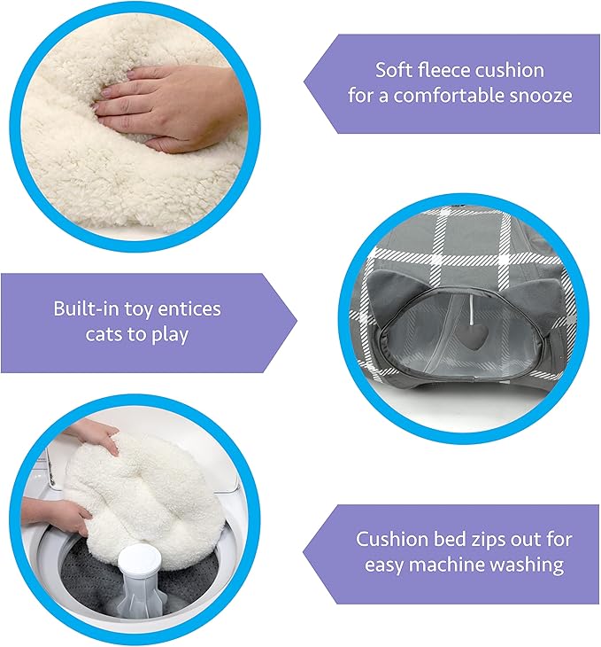 - NAP AND PLAY: The Kitty City Plaid Cat Tunnel Bed combines everything your feline friend could love in one convenient set. It’s a tunnel, a bed, and a spot to swat and play all in one! And better still, it’s easy to assemble.