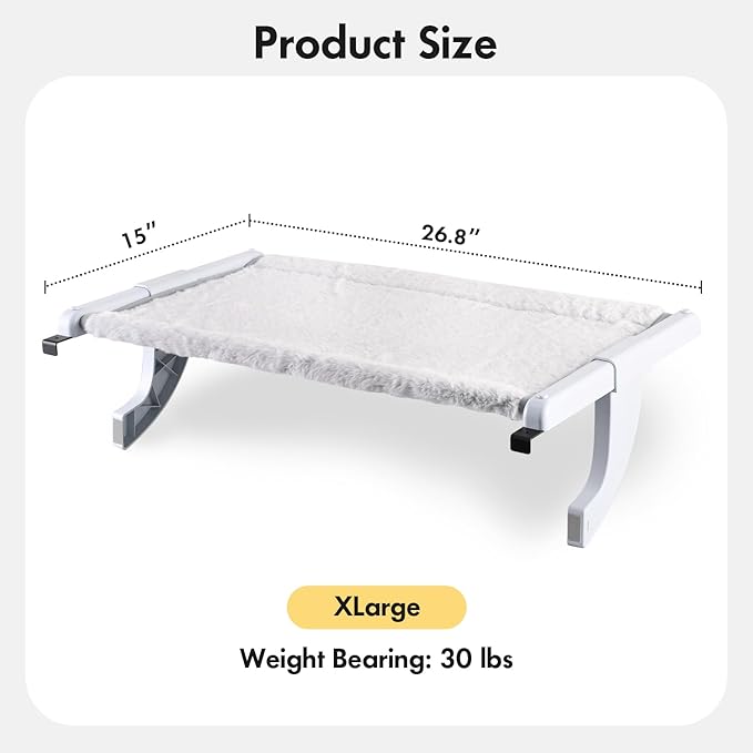 - Stable Structure for Great Comfort & Safety: The support frame is connected by two hard metal straight pipes, making the whole perch extremely strong and solid, can holds up to 40lbs. The product dimension of the medium size is 22.8''x11.8'', the large size is 24.4''x11.8'' and the x-large size is 26.8''x11.8'', suitable for cats of all size.