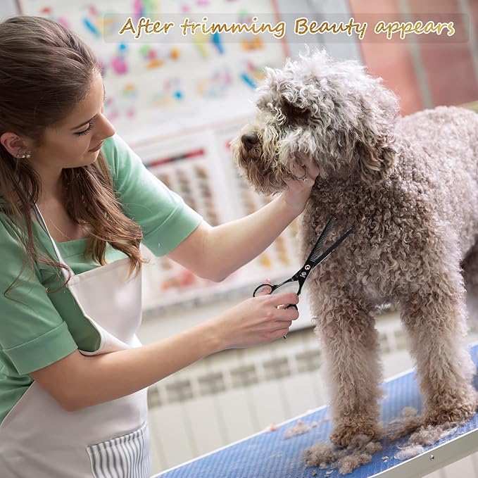 - ★Professional Pet Grooming Scissors Kit★-The kit includes 1 × 7.3-inch thinning shear, 2 × 7.7-inch curved scissor, 1 × 7.7-inch straight scissor, 1 × pet comb, 1 × cleaning cloth, 1 × black leather case