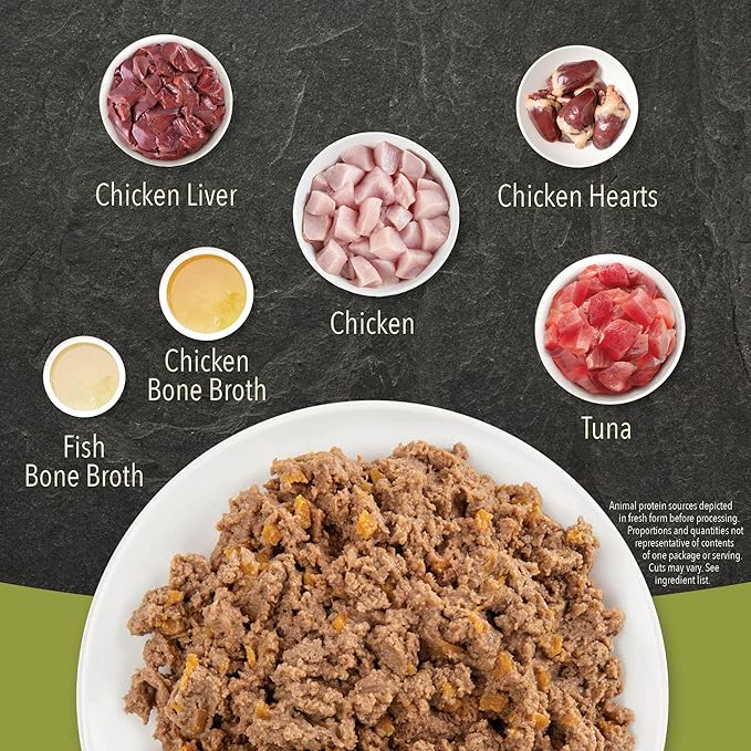 - High protein cat food recipe includes 85 percent** animal ingredients and features raw* chicken, tuna, chicken bone broth, fish bone broth, chicken liver and chicken heart