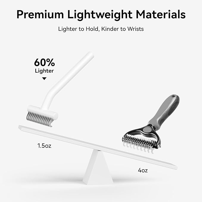 - 【QUAILTY · Long-Lasting Material】Our dog shedding brush is made with durable 420 stainless steel and high-quality PP material. Rust-resistant and ultra-lightweight at just 1.5oz, it’s about 60% lighter than most similar products—making it easier to hold and reducing wrist fatigue during grooming. The 2.2-inch-wide stainless steel blade easily reaches mat-prone areas like the armpits, legs, and belly, while also covering the entire body for thorough deshedding and smoothing. Daily grooming becomes easier, faster, and more effective.
