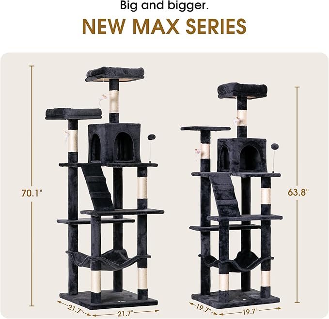 MWPO 70.1-Inch Large Cat Tree, Multi-Level Tall Cat Tower for Indoor Cats, Plush Cat Condo with Big Padded Perches, Sisal-Covered Scratching Posts, Hammock, Toys for Kittens & Cats - Smoky Grey