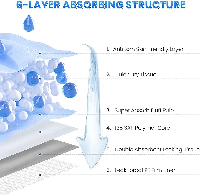 - 【Faster Absorption with Diamond Quilting Surface】Our doggy pads are made of 6 strong layers material to prevent tearing, the diamond quilted design with super water locking fast diversion, faster infusion and absorption of liquid, make dog training pads are easy to pick up without leakage or overflow