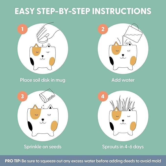 - Includes everything you need: A ceramic cat planter, potting soil disk, seeds for planting edible grass, and simple instructions. Just add water
