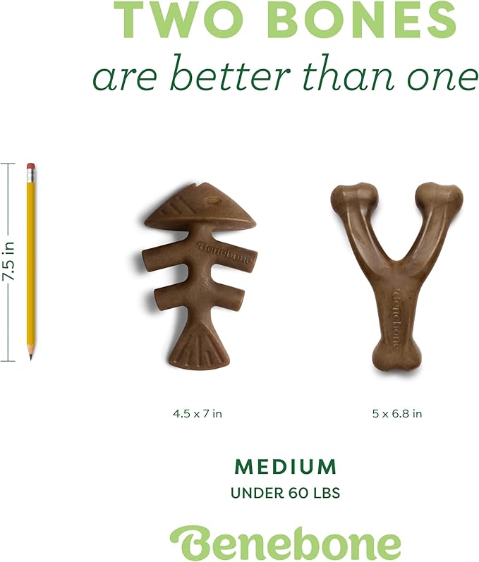 Benebone 2-pack Fishbone/Wishbone Durable Dog Chew Toys, Real Fish, Real Bacon, Made in USA, Medium