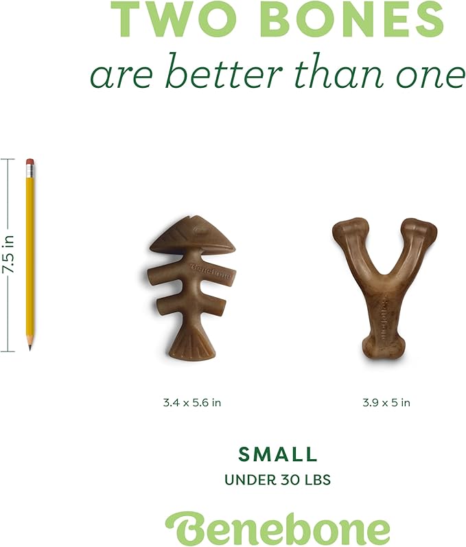 Benebone 2-pack Fishbone/Wishbone Durable Dog Chew Toys, Real Fish, Real Bacon, Made in USA, Small