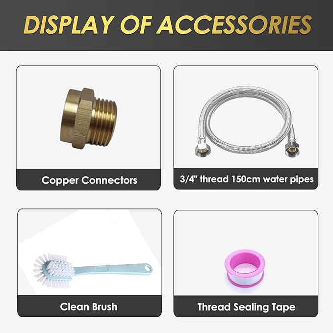 - 【Easy to install】Complete fittings, including cleaning brush, waterproof tape, 3/4" water hose, 3/4" water valve, copper connectors. Copper Connector make it easier to connect the water pipe to the 3/4" GHT faucet. Tips: Copper connectors need to be put into two"O"sealing rings
