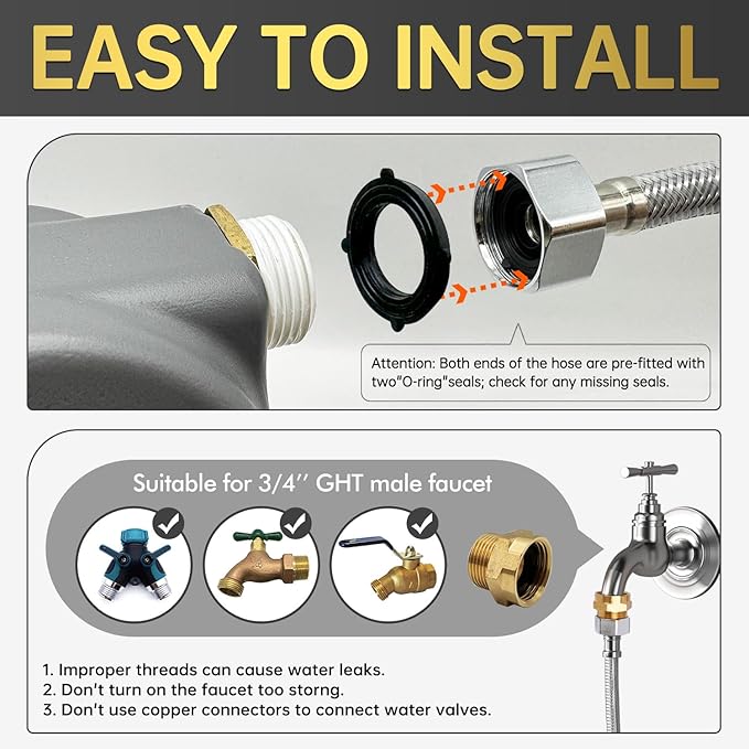 - 【KIND TIPS】1.In areas with high water pressure, the water valve may fail. 2.Please confirm the size of the water joint. This product is suitable for 3/4'' GHT water faucet. If there is water leakage at the water pipe connection, please use an extra sealing ring or check if the thread is suitable. You can view the video or instructions on this page for details