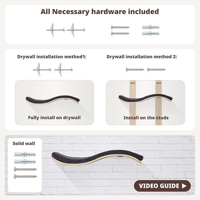 - Easy Installation - our wavy cat wall shelf includes installation instructions, screws, drywall anchors, and more. The hidden brackets are spaced 16 inches apart, providing flexibility to mount the shelf into wall studs or a solid wall. Installation is a breeze, and it only takes five minutes to create a floating cat shelf!