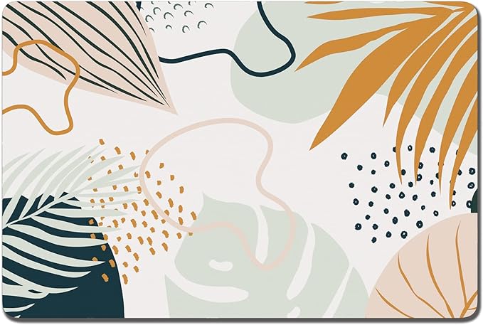 Rnivvi Dog Food Mat, 12" x 19" Boho Absorbent Dog Cat Bowl Mat for Food and Water, Cute Anti-Slip Rubber Pet Feeding Rug Protect Floors, Puppy Placemat for Feeding & Watering Supplies, Tropical Leaves