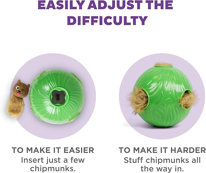 - Multiple games in one – dogs remove the chipmunk plush toys and roll the ball to release hidden treats; check out our Tips & Tricks for ways to make the game easier or harder for your pet