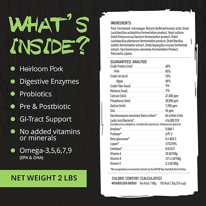 - ADVANCED NUTRITION: Our formula consists of natural heirloom pork protein, omega 3, 5, 6, 7, 9, prebiotics, probiotics, postbiotics, and vitamin A, D and E. Fill in the nutritional gaps left by typical dog food diets and picky eaters!