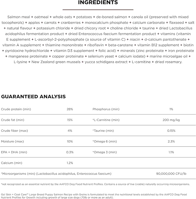 Go! Solutions Skin + Coat Care, Dry Dog Food, Large Breed Puppy Salmon Recipe with Grains, 25 lb Bag