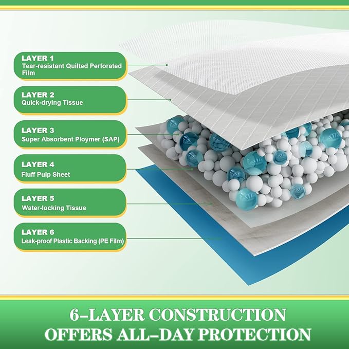 - Super Absorbent and Quick Drying: DEEP DEAR's 6-layer protection design makes our thickened large dog training pads are much more absorbent than most wee wee pee pads for dogs on the market. The dog pee pad uses new premium material perforated film as the top layer of the puppy potty pad which can speed up the liquid to pass through the surface than common non-woven fabric and keep the surface quick-drying, comfortable, no puddling, and no tracking.