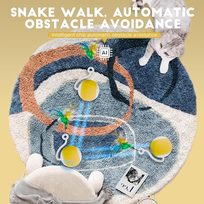 • Indoor Cat Toys-2 Speed Modes : Cat toy ball two speed modes switch at will. High speed is suitable for active adult cats. Low speed is suitable for kittens and old cats, and timid cats will not be afraid. Irregular movement trajectory scurrying like a mouse, arouse the interest of cats, stimulate the predatory nature of cats, so that cats are not bored all day.