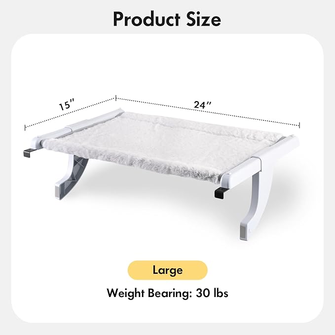 - Stable Structure for Great Comfort & Safety: The support frame is connected by two hard metal straight pipes, making the whole perch extremely strong and solid, can holds up to 40lbs. The product dimension of the medium size is 22.8''x11.8'', the large size is 24.4''x11.8'' and the x-large size is 26.8''x11.8'', suitable for cats of all size.