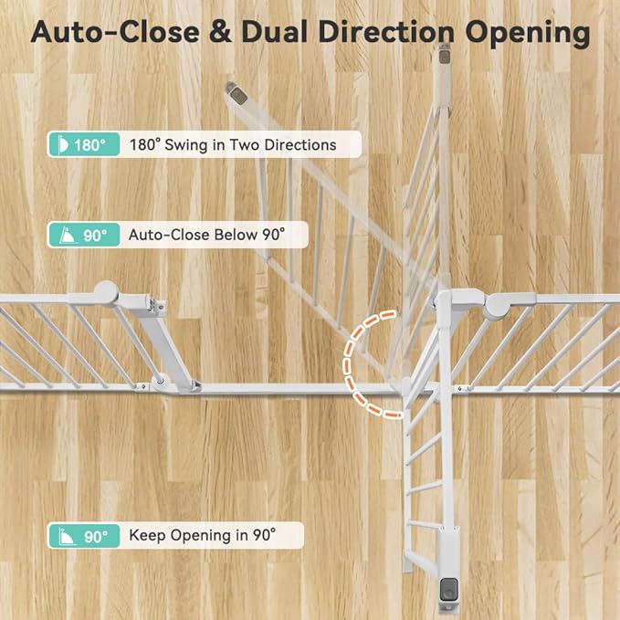 - Auto Locking & Double Safety: Our baby gate features a double-locking mechanism that locks both at the top and bottom. Simply press the button and lift it with one hand to unlock. It's easy for adults but challenging for children and pets. The dog gate automatically closes when the opening angle is less than 90Β°, and the door can swing in dual directions