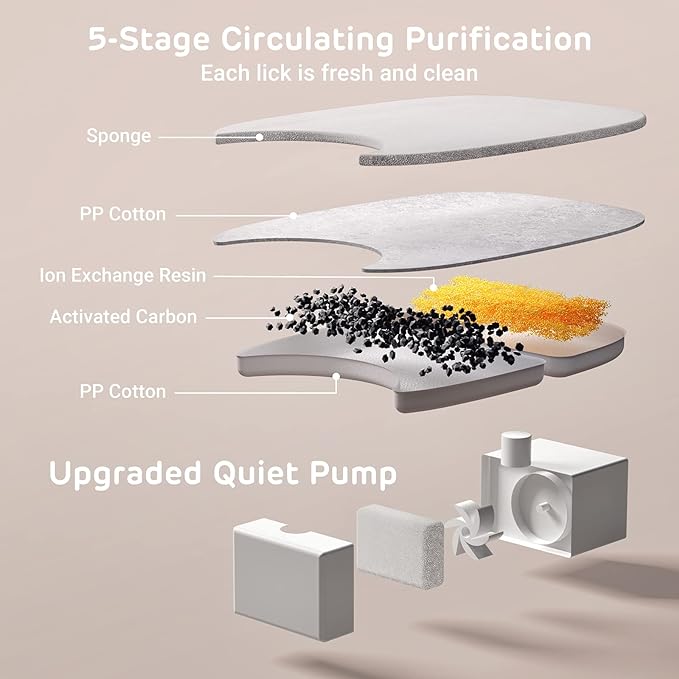 - Whisper-quiet Operation - The water fountain for cats inside features a CE certificated IP68 pump, which runs with 2W low consumption. The only sound you may hear is the water dripping through the strainer into the bowl.