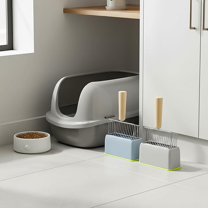 - CONVENIENT STORAGE - The included storage stand makes storing and organizing litter scoop a breeze. The holder is customized according to the shape of the shovel, with a seamless fit. The kitty poop scoop easily slots into the holder, keeping the scoop off the ground and within reach. It can also prevent any cat litter left on the cat litter shovel from scattering on the floor.