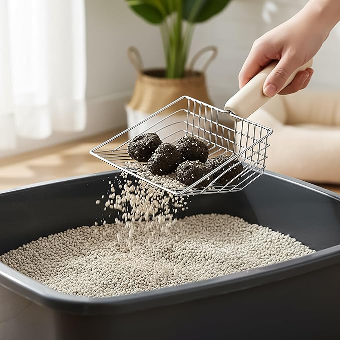 - DURABLE MATERIAL - Our kitty litter scooper is made of high-quality metal that are built to last. The metal construction ensures that it won't rust and can withstand all kinds of bumps. The base is made of selected ABS material, which is durable, wear-resistant, and not afraid of damage. And the solid wood handle adds a touch of warmth and comfort to the design.