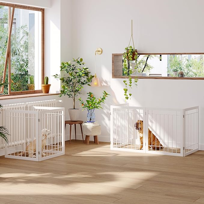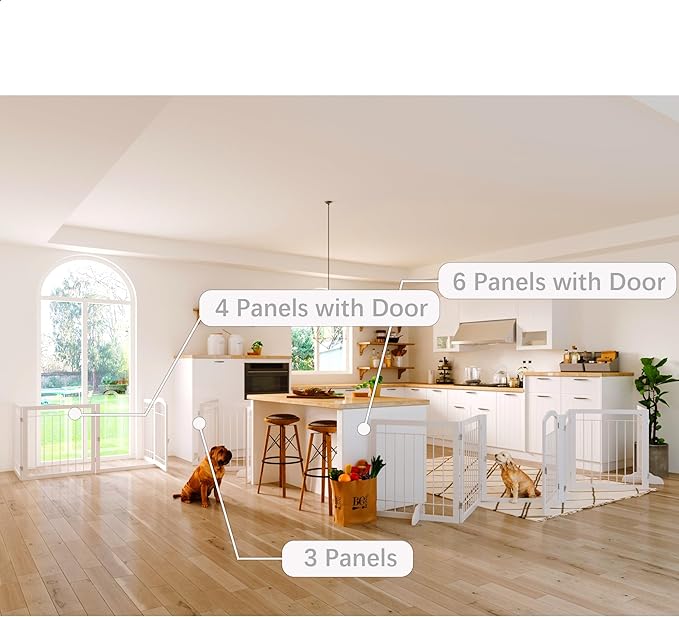 - 【SIMPLE & STURDY PET GATE】This convertible freestanding dog gate is a pet fence, room divider, and pet pen all in one.