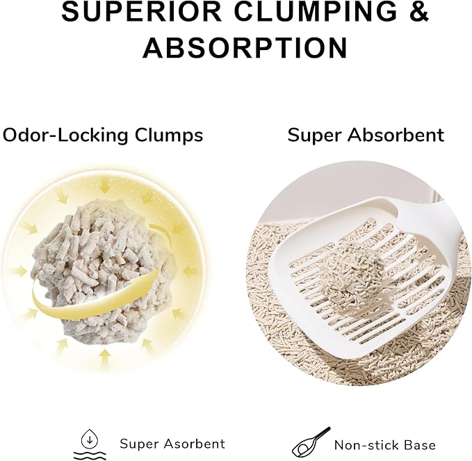 - QUICK CLUMPING & FLUSHABLE: 2-seconds absorption & 3-seconds cat litter clumping. The tofu litter forms tightly, clumps quickly, scoop easily because of its anti-stick feature. The cat tofu litter can be flushed away in the toilet, saving your time. (Reminder: Please do not flush too much litter once a time.)
