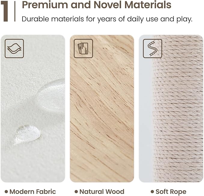 - Premium and Novel Materials: This aesthetic cat tree combines sturdy natural wood for elegance, soft polyester fabric for comfort and easy cleaning, and scratch-resistant cotton rope that is gentle on your cat's claws