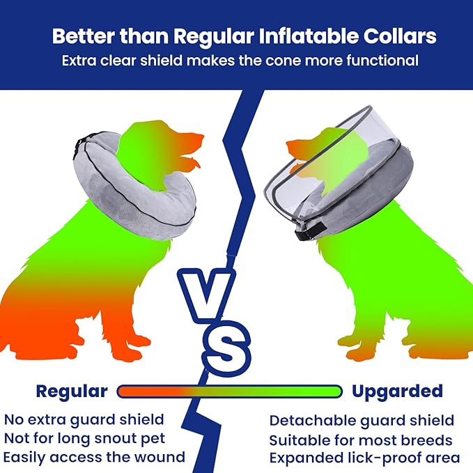 - Helps the Healing Process: While wearing a dog cone collar may affect your dog's comfort, the dog inflatable neck collar offers a more pleasant experience compared to traditional plastic cones. Its rounded design creates a barrier that prevents your pet from aggravating his/her wounds. Similar to an inflatable neck pillow, it doesn't block your dog's vision and minimizes discomfort. Plus, if your dog bumps into something, there’s no frightening noise, making the healing process less stressful