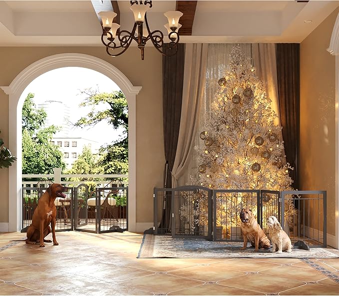 - 【SIMPLE & STURDY PET GATE】This convertible freestanding dog gate is a pet fence, room divider, and pet pen all in one.