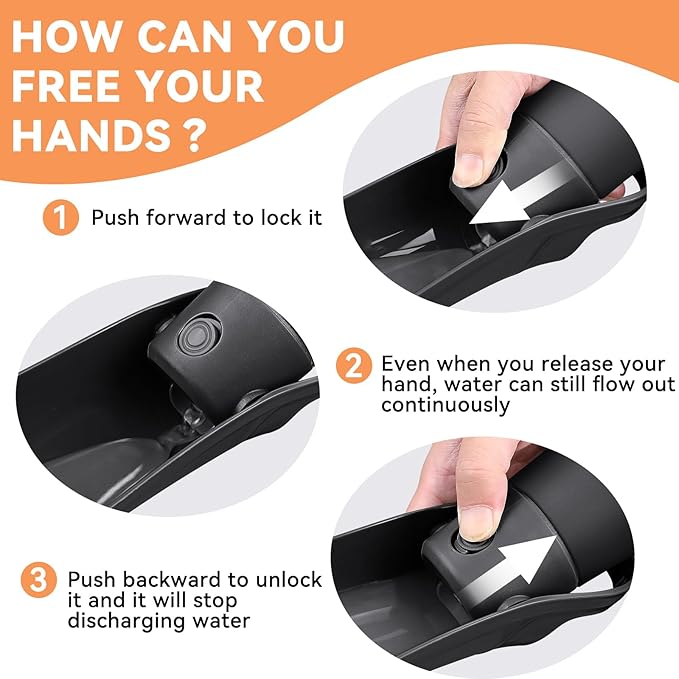 - Easy to Use & Recyclable Water: Quickly turn over the leaf-shaped dog water bowl, then press the button to allow water flow and quench your doggie's thirst. Press the button and push it forward to lock it, and the water will flow out continuously. After drinking, press the button and tilt back, excess water will flow back into the bottle. This helps reduce water waste.