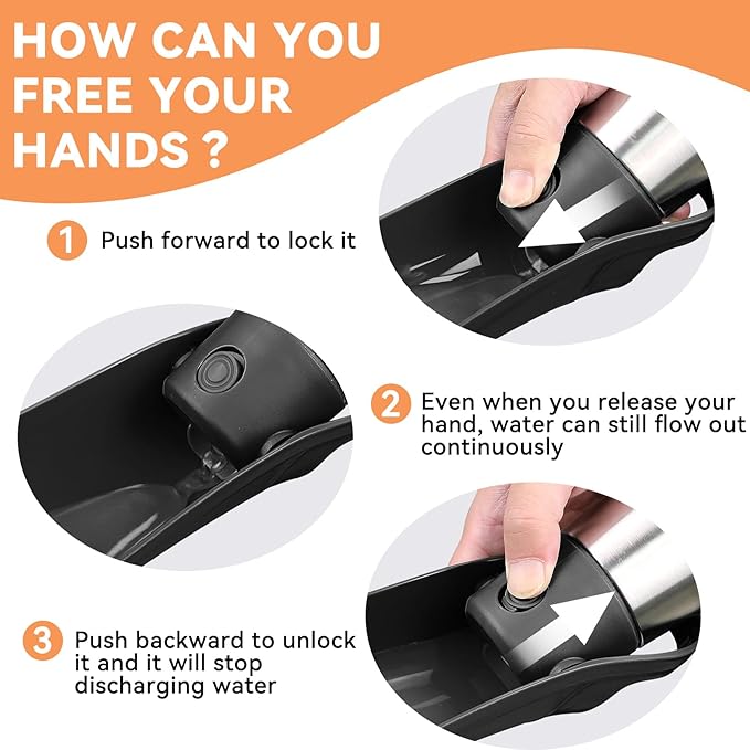 - Easy to Use & Recyclable Water: Quickly turn over the leaf-shaped dog water bowl, then press the button to allow water flow and quench your doggie's thirst. Press the button and push it forward to lock it, and the water will flow out continuously. After drinking, press the button and tilt back, excess water will flow back into the bottle. This helps reduce water waste.