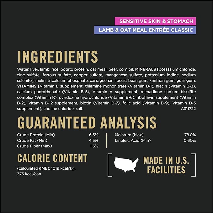 Purina Pro Plan Sensitive Skin and Stomach Dog Food Wet Classic Pate Lamb and Oat Meal Entrée - (Pack of 12) 13 oz. Cans