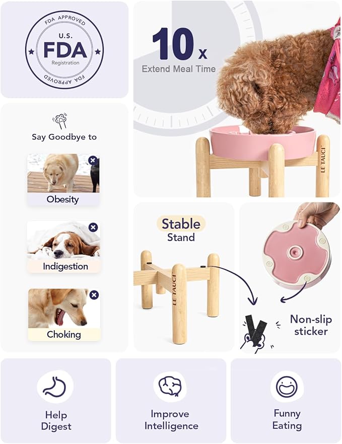 LE TAUCI Ceramic Slow Feed Dog Bowls, Elevated for Small Breeds, Anti-Gulping, Non-Slip, 6 inch, Pink