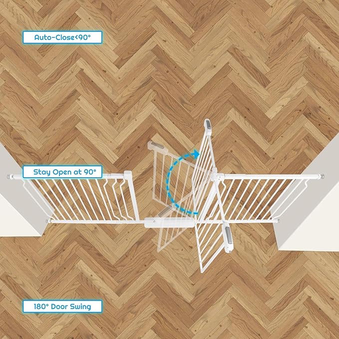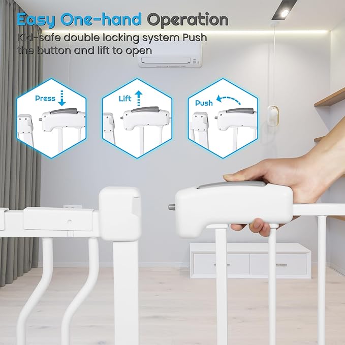 - Safe Double Lock & One Hand Operation: The safety gate latch with an ergonomic handle can be released with one hand, convenient when holding a baby in the other hand. Just press the latch down, pull back and lift slightly. Easy for adults, but difficult for toddlers, children or kids. Two-way swinging door. If opening angle is less than 90°, baby gate will be closed automatically; but if opening angle is more than 90°, baby gate will keep opening.