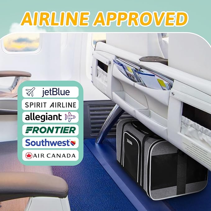 - 【AIRLINE APPROVED CARRIER 】Unfolded size:17"L×12"W×8.5"H, Petskd pet carrier is airline approved and can be placed under the seat in the cabin, it is mainly designed for ①JetBlue Airlines:17x12.5x8.5" ②Allegiant Airlines:19x16x9", but also in compliance with ③Southwest Airlines:18.5x13.5x9.5" ④Air Canada:21.5x15.5x10.5". We recommend you buy this carrier when you fly with the above-mentioned airlines.