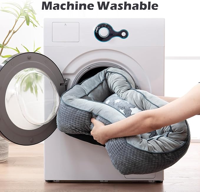 - Fashion Luxury Fabric: The comfortable dog bed is designed with gray Corn kernel stripes on the outside, and soft shu velveteen fabric on the inside, which is more fashionable with the Pentagram pattern. The side is designed with artificial suede wide strip edging, providing sufficient support for the dog bed. The filling material is 100% polypropylene cotton. which is safe, comfortable, and skin friendly.