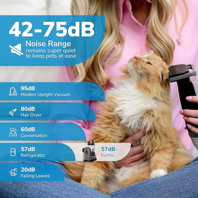 - QUIET OPERATION: Designed with your pet’s comfort in mind, furMe operates quietly at 42-75dB noise range and minimizes vibrations to keep your pets calm and relaxed during their grooming.