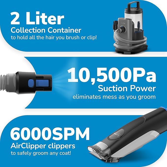 - MESS-FREE: Our 10,500Pa Suction power captures about 99% of pet hair and dander as you groom. Say goodbye to sweeping up after a grooming session with our large 2-liter collection bin.