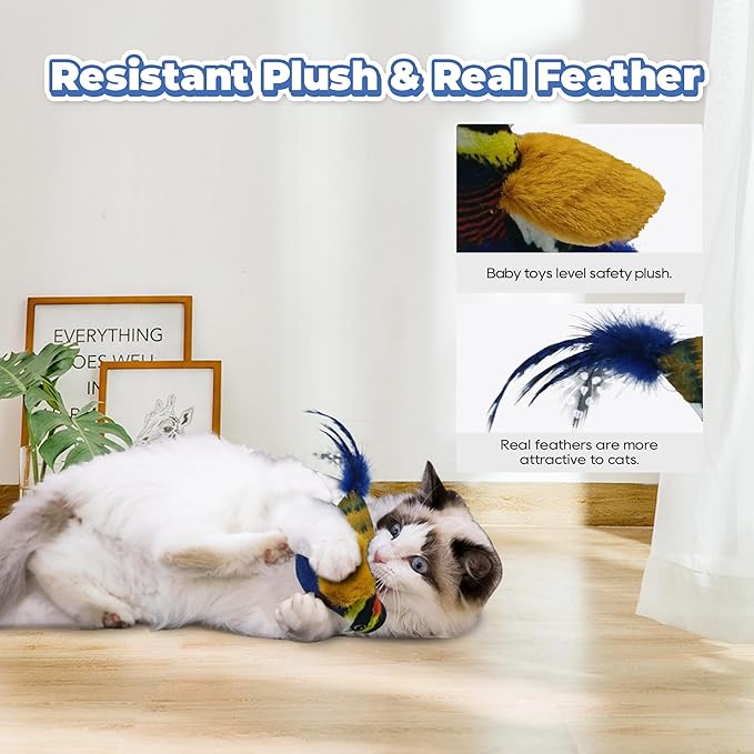 - Chirping Birds: Two orange and black colored tits can emit a realistic bird song when touched, stimulating the cat's hunting instinct and beckoning every pat, bite, chew, and chase