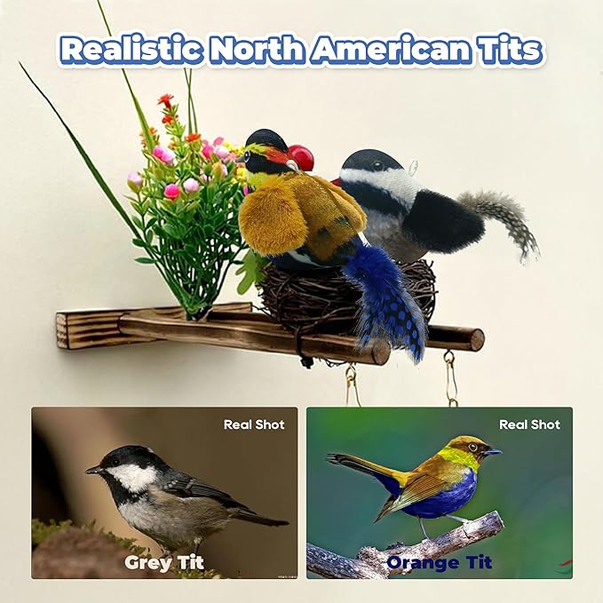 - Hyper Simulation Design: The simulated chirping tit is 4 inches in size and is made of soft plush and natural feathers. It has a built-in birdsong mechanism and supports up to 10000+ chirps