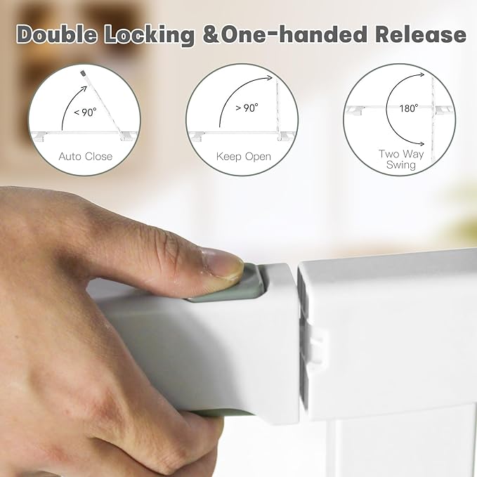 - 【AUTO CLOSE BABY GATE】 No worries forgetting to lock the safety gate, It will automatically shut at a less than 90-degree angl. You can even open it with just one hand, making it easy to carry your baby through.