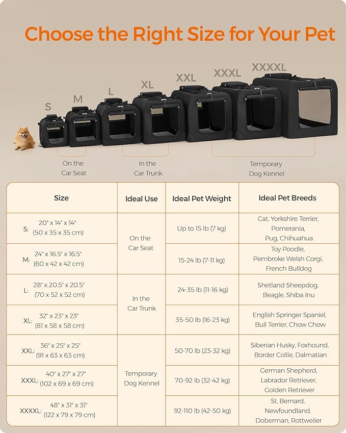 - 【CHOOSE THE RIGHT SIZE】This 28" x 20.5" x 20.5" collapsible dog carrier is ideal for pets between 24-35 lb. Please read our tips on the pictures to measure your pet and choose the right size