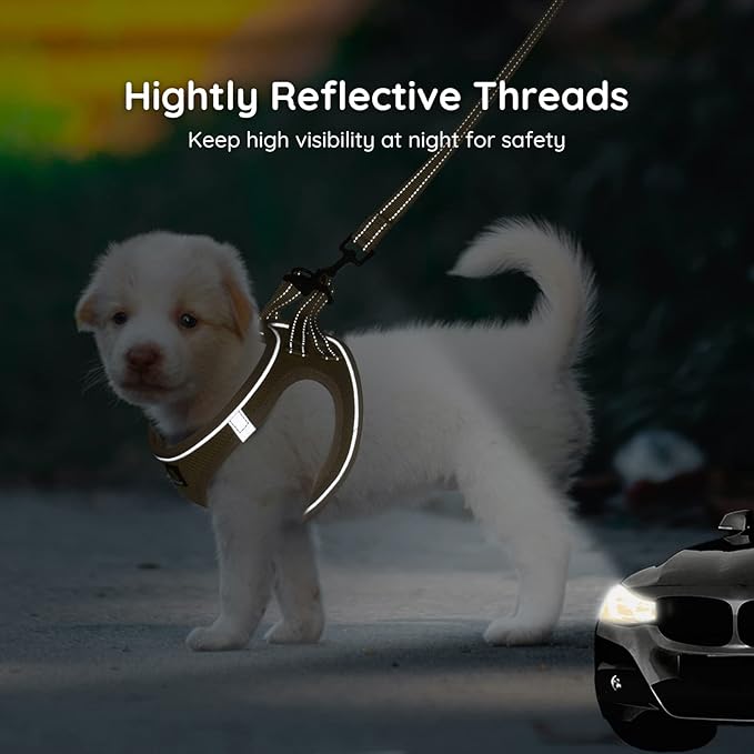 - 【Safe and Comfortable Harness】With reflective strip design, the dog harness strip provides extra visibility and safety for day or night walking. The leash also has reflective strip, more safety.