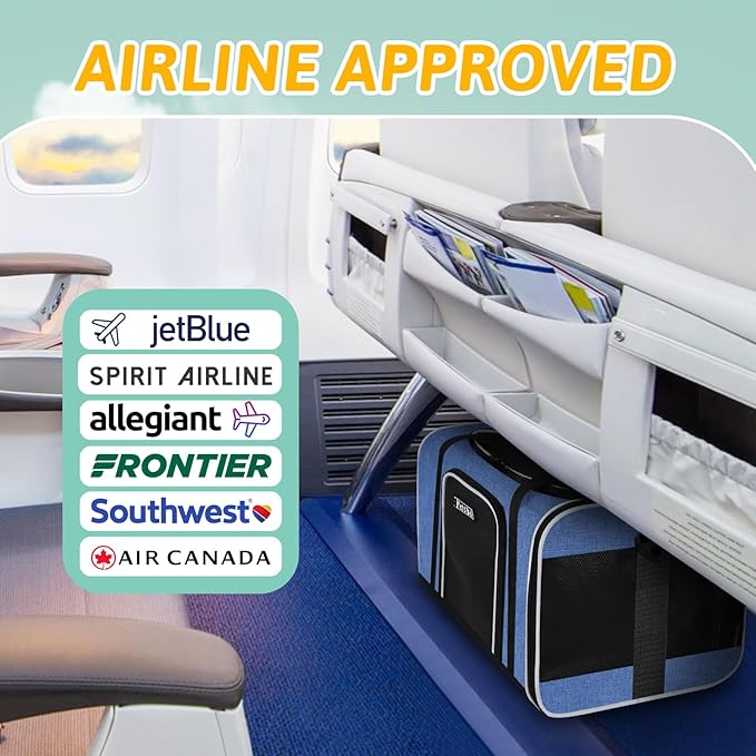 - 【AIRLINE APPROVED CARRIER 】Unfolded size:17"L×12"W×8.5"H, Petskd pet carrier is airline approved and can be placed under the seat in the cabin, it is mainly designed for ①JetBlue Airlines:17x12.5x8.5" ②Allegiant Airlines:19x16x9", but also in compliance with ③Southwest Airlines:18.5x13.5x9.5" ④Air Canada:21.5x15.5x10.5 ⑤Spirit Airlines:18x14x9" ⑥Frontier Airlines:18x14x8". We recommend you buy this carrier when you fly with the above-mentioned airlines.