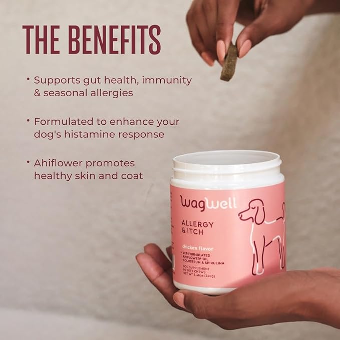 WagWell Allergy and Itch Chews – Chicken Flavored – Plant Based with Colostrum and Spirulina – Dog Skin and Coat Supplement for Itch Relief and Digestive Health, 60 Chews