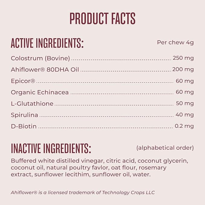 - YEAR-ROUND AND SEASONAL DOG ALLERGY RELIEF: An 8.5-oz. jar contains 60 soft allergy chews for dogs itching and licking irritated skin; these chicken-flavored allergy relief dog chew treats contain Colostrum, Epicor, Organic Echinacea, L-Glutathione, Spirulina and D-Biotin, and are suitable for dogs of all ages and sizes.