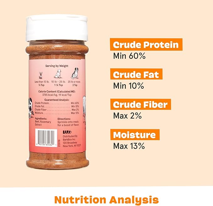 - Limited Ingredients: With only two ingredients - beef & rosemary, this product is ideal for health-conscious dog owners. Catering to both large and small breeds, it complements your pet's dry dog food seamlessly, offering a natural dog treat option sprinkled over the dog bowl.