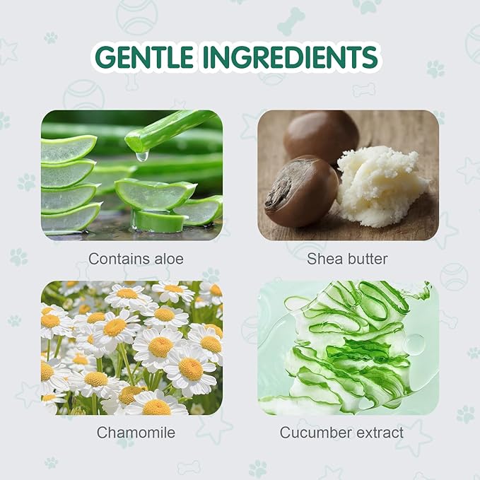 - GENTLE INGREDIENTS: Contains aloe, shea butter, chamomile and cucumber extract, helping clean, refresh and condition while giving the coat a healthy shine. Perfect for wiping away odor, dirt and dander from paws, body and bottom between baths.