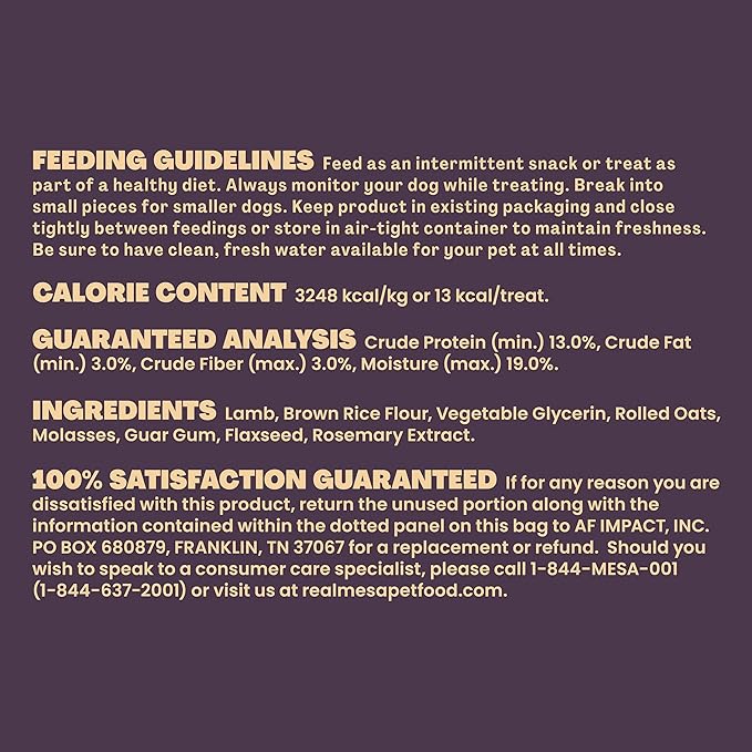 - Convenient 9 oz Size - The Reál Mesa soft and chewy Lamb treats come in a convenient 9 oz package, making them easy to carry on the go. Keep them in your purse, car, or dog-walking bag for a quick and satisfying reward anytime, anywhere