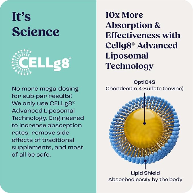 - LIQUID FORMULA FOR QUICK ABSORPTION: Unlike traditional bites, chews, and treats, our liquid supplement is absorbed up to 10x more – targeting your dog’s joint support where they need it most. Utilizing CELLg8 liposomal technology, our OptiC4S survives the digestive system - unlike bites, chews, and treats that get damaged and degraded in the stomach.